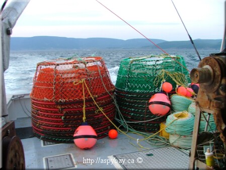 On the top of the red pile of traps above a rope with a hook can be seen. This goes to a pulley and then to a cargo winch mounted 15 feet above the deck. This allows the traps to be lifted and moved around the deck by hydraulics power rather than muscle power.