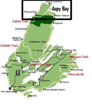 This site promotes all areas of Northern Cape Breton. This area is enclosed in the black box below. Communities in Northern Cape Breton include Pleasant Bay, Bay St. Lawrence, Neil's Harbour and the following communites located around Aspy Bay (Cape North & Dingwall).